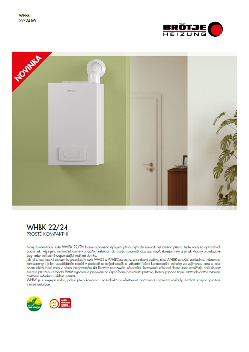 1x Kotel WHBK 22/24 ; nástěnný kondenzační plynový kotel s 4 stupňovým modulačním čerpadlem a vestavěným 45 l nerezovým zásobníkem pro ohřev teplé vody